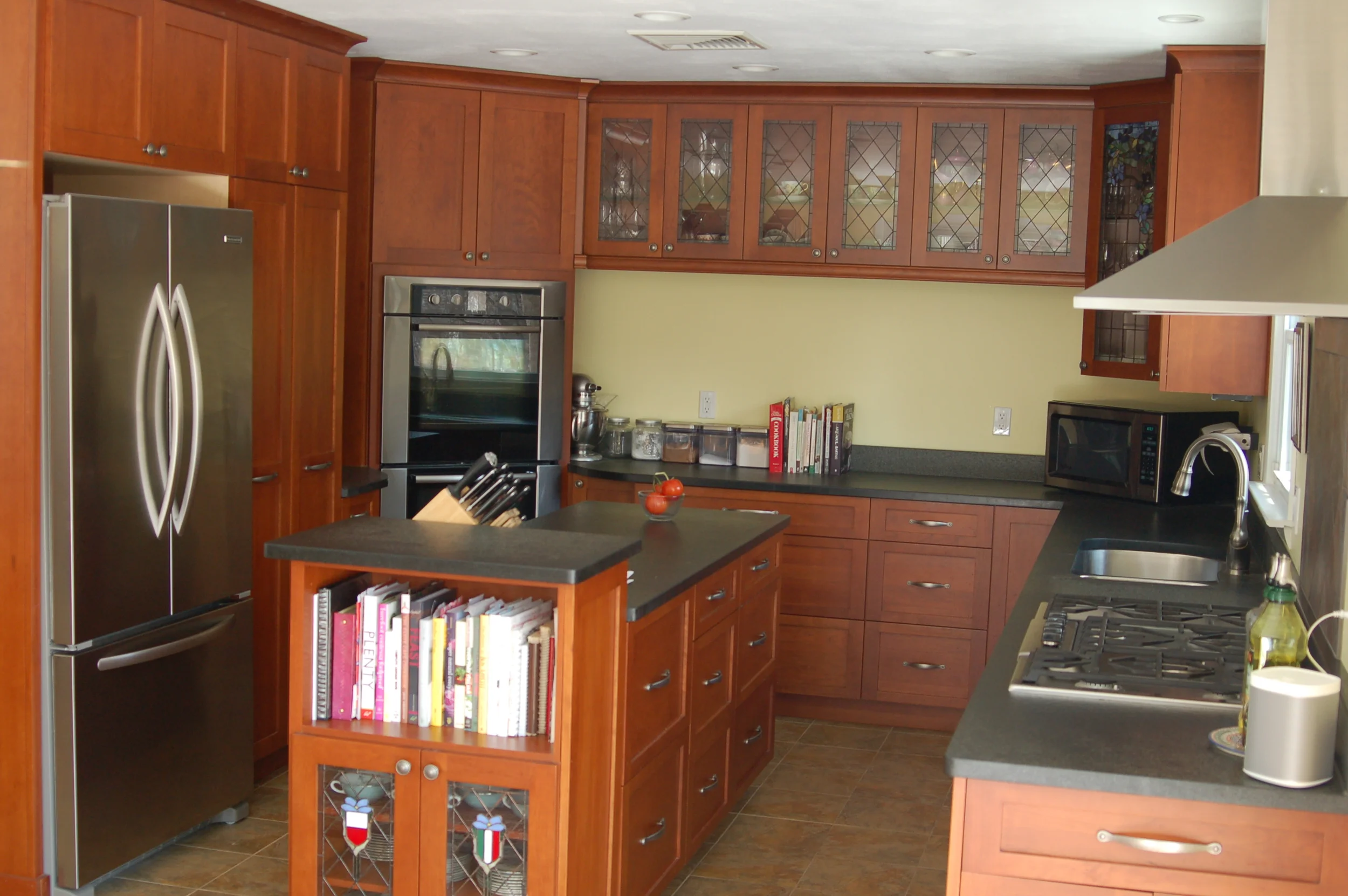 We removed a wall between the existing kitchen and the dining room, creating a "great room". The remaining walls and ceiling were replaced and insulated. The several layers of vinyl flooring were exchanged with porcelain tile throughout. We closed off an exterior door to create more cabinet and counter space. The dark dated cabinets were replaced with semi-custom cherry cabinets. Recessed lighting gives plenty of light and leaves the space open and airy. Black granite counter tops, an accent backsplash, and custom glass in the display cabinets added finishing touches.